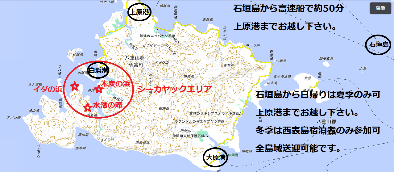 白浜港より海上(船浮湾)に漕ぎ出します。海の深度によって美しい西表の海は幾重にも変化します。忘れられない景色になるでしょう。かなりの高確率でウミガメにも出会えます。尚、冬季は季節風の関係で海に出られない場合が多くあります。シーカヤックツアーのお申し込みは夏季がお勧めです。亜熱帯の島の変わった動植物の説明、西表島の歴史や自然環境などガイドが詳しく解説しながら一日過ごすことが出来ます。普段の生活では決して味わうことが出来ない特別な時間と経験をご提供致します。気象状況によりコースが変更になる場合がございます。